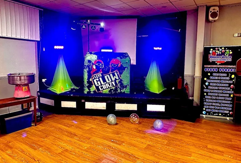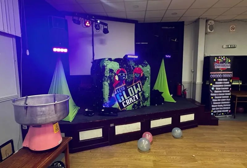 Disco and DJ with lights ULTRA VIOLET lighting ( UV PAINT NOT SUPPLIED)Bubble and Snow machineSmoke machine ( Venue Dependant) Candy floss machine can be added at aditional charge based on aprox servings which is always a great add on.